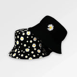 This bucket hat offers two looks in one — one side features a bold black base covered with white floral patterns, while the reverse side comes in a clean, solid Colour like beige, pink, white, or black with a single embroidered flower on the front.